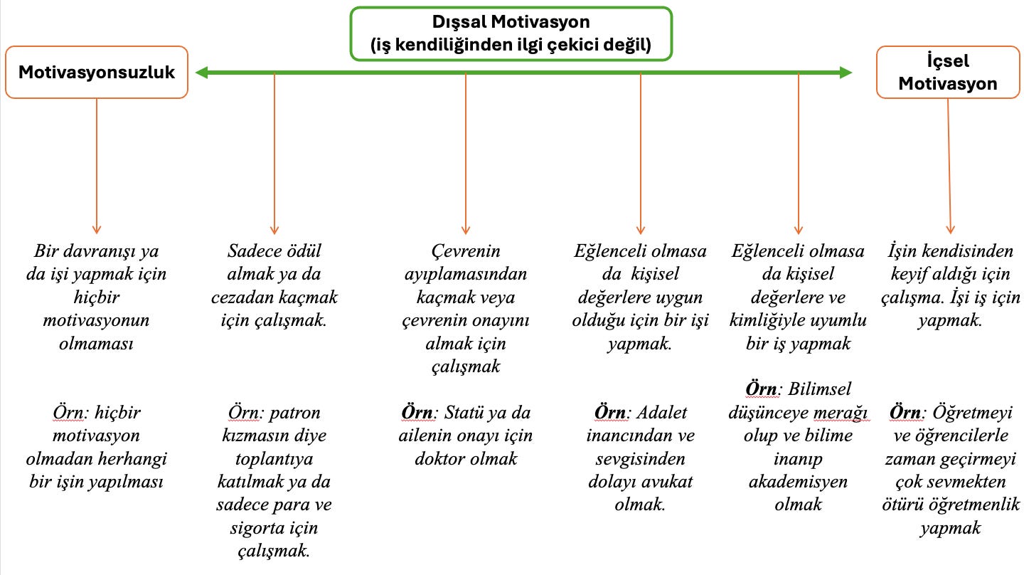 Şimdi bir çizgi hayal edelim. Bu çizginin en solu tamamen motivasyonsuz olduğumuz ve bu işten kaçmak için her türlü fırsatı kovaladığımız yer olsun. En sağı ise çevremizdeki insanların bize “Çocuğum yoruldun artık!” dediği türden sevgi ve heyecanla yaptığımız bir işe sahip olduğumuz yer olsun. Öz-belirleme kuramına göre yukarıda bahsettiğim üç ihtiyacın karşılanma oranına göre hepimiz bu çizginin bir noktasındayız. Aşağıda ise bu çizginin duraklarını yazdım:
